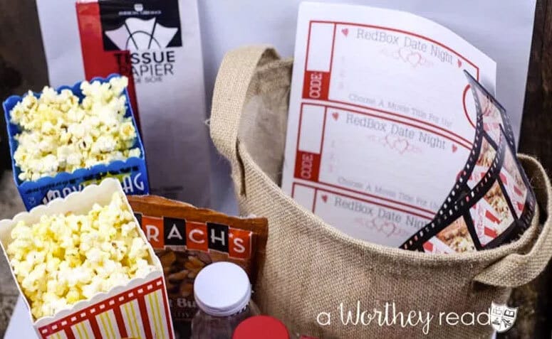 Se seu(ua) namorado(a) é louco(a) por filmes, esse é um presente barato e muito criativo. Basta juntar, em uma cesta (ou caixa, que você pode personalizar como preferir), algumas guloseimas como pipoca, amendoim, chocolate e bebidas e dar como um “vale 1 noite de cinema”. Além disso, você pode incluir lencinhos e os “ingressos” personalizados. Escolha um filme romântico ou de outro gênero que vocês curtam.