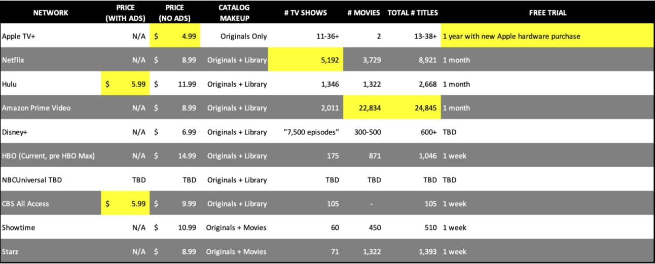 Em vez de licenciar qualquer conteúdo de terceiros – como a Netflix, o Hulu e o Amazon Prime Video criaram originalmente suas bases de assinantes – o Apple TV Plus apresentará apenas o Apple Originals. Isso faz sentido em 2019, uma vez que os custos de licenciamento das melhores séries de TV clássicas dispararam quando os estúdios recuperam seus direitos de distribuição para criar suas próprias ofertas diretas ao consumidor. Agora, os estúdios perceberam o valor das séries com demanda duradoura do consumidor e muitos episódios, e buscam capitalizar seu conteúdo antigo na esperança de que ele traga um novo sucesso.