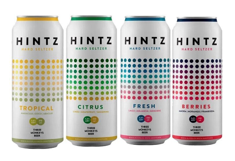 Outra cervejaria que tem uma hard seltzer é a carioca Three Monkeys. A dela, apresentada em fevereiro do ano passado, é a Hintz, com quatro variedades. Uma delas mistura grapefruit, tangerina e limão, tem 5% de teor alcoólico e custa 15,99 reais (310 mililitros).