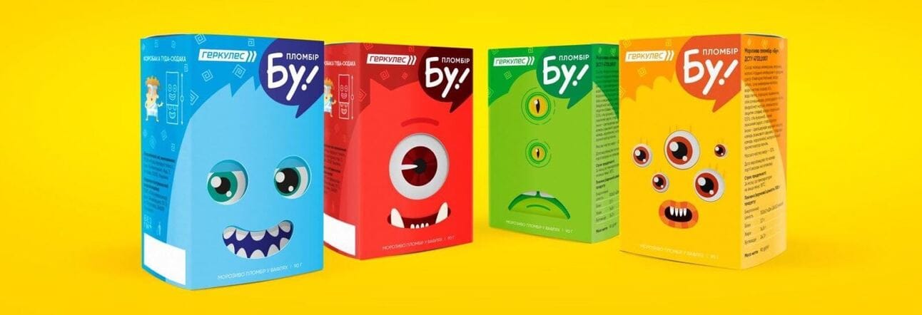 Essa série de 4 embalagens do sorvete Hercules, da Ucrânia, podem ser usadas para brincar com as crianças. Ao deslizá-las para cima e para baixo, os monstros mudam de rosto e de expressão.