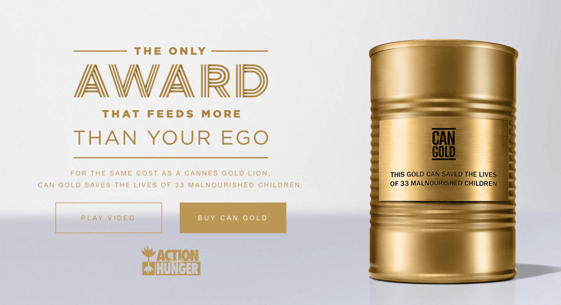 A proposta é que os vencedores dos leões de ouro comprem uma Can Gold, uma lata que representa alimentos para 33 crianças, com toda a operacionalização feita pela Action Against Hunger. A lata com o nome gravado funcionaria em substituição ao leão de ouro. Funciona também para quem não ganhou mas deseja apoiar.