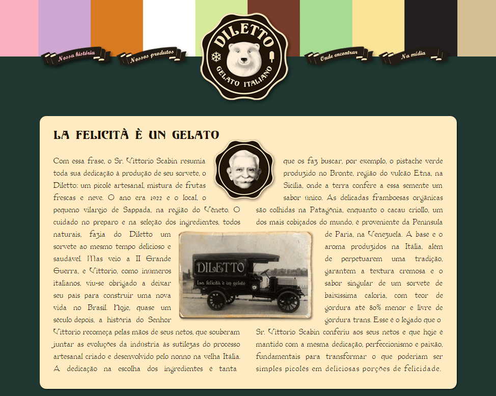 Mas como todos sabem, não foi isso que a Diletto fez. Ao invés desse filme fantasioso, o que a marca fez foi publicar essa história por escrito em peças de comunicação como o site da marca. Junto do texto há a fotografia de um carro de sorvete antigo. A fotografia e o discurso do texto fazem entender que se trata de algo verídico, ao invés de intencionalmente levar para o mundo do imaginário e lúdico. Parece-me então que a “forma” escolhida para contar a história é o que por fim, criou o atrito direto em relação ao limite entre “fantasia X realidade”.