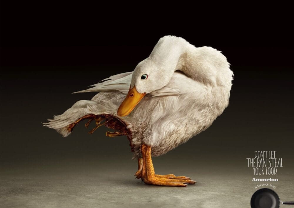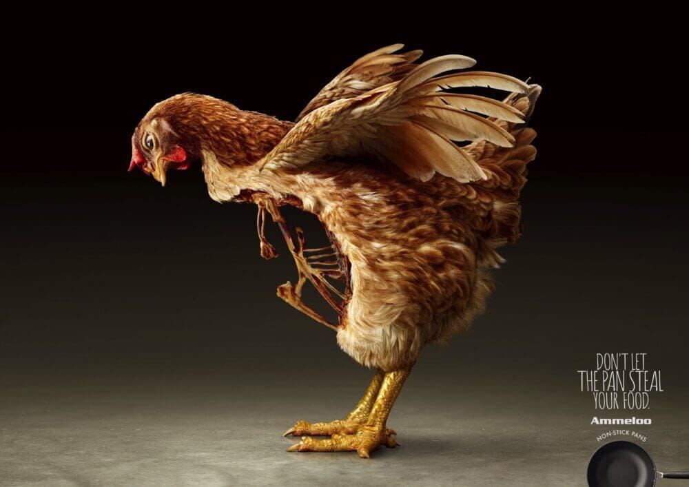 A campanha criada pela agência chinesa Amber para as panelas anti-derrapantes Ammello tem 3 anúncios recomendando que você não use uma panela que fica com um pedaço da sua comida (porque gruda). E para deixar isso claro, usaram animais ainda vivos, com um tecão arrancado.