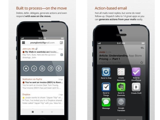 A ideia de entrar na briga junto com outros apps já bem conhecidos como o Sparrow e o Mailbox surgiu da vontade de poder responder emails com textos já prontos (snippets) sem precisar ficar digitando o tempo todo as mesmas instruções, já que ambos prestavam serviço de suporte à clientes. Assim nasceu o Dispatch, que depois deste primeiro momento acabou virando uma maquininha de despachar coisas recebidas por email, usando até outros 22 apps como o Evernote, calendários, to-dos, SMS, Pocket, Twitter, Facebook, etc.