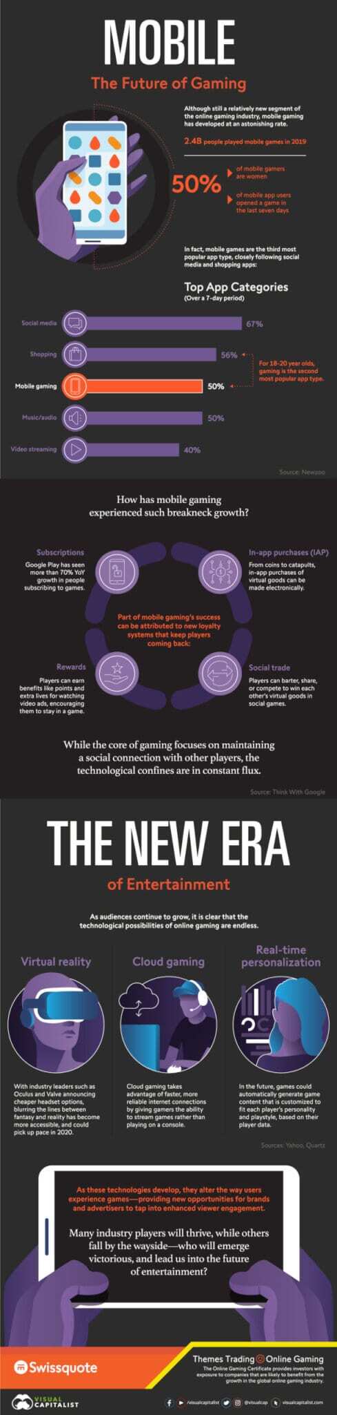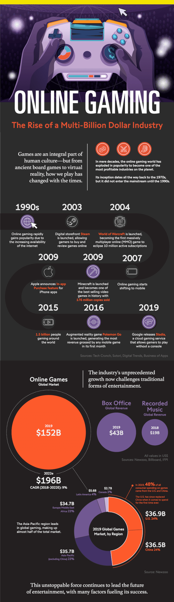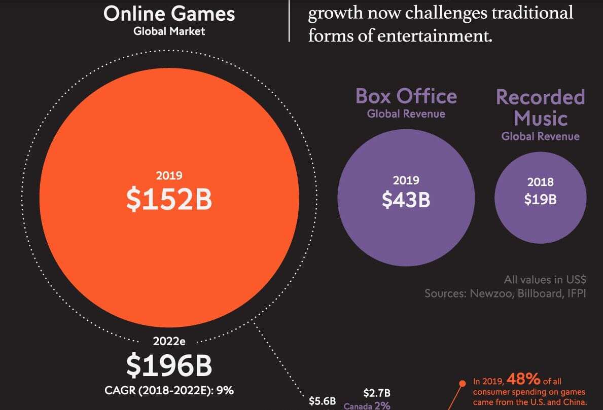 O mais recente infográfico da Visual Capitalist “Online Gaming: The Rise of a Multi-Billion Dollar Industry” mostra a enormidade e o crescimento meteórico da indústria dos games online. A cifra de 196 bilhões de dólares é mais do que o dobro do faturamento das outras duas representantes do entretenimento, o cinema e a música.