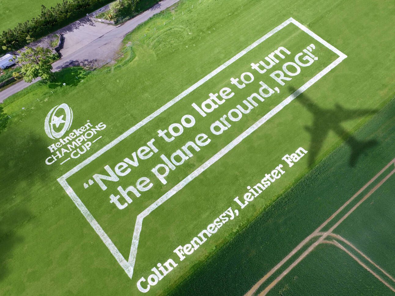 Neste final de semana aconteceu a final do campeonato de Rugby em Dublin. 48 horas antes do jogo, quando o avião do time adversário estava programado para aterrizar, um fazendeiro que mora próximo ao aeroporto, contou com a ajuda da Heineken (patrocinadora do seu time) para pintar uma gigantesca mensagem no chão, dirigido ao treinador do La Rochelle, Ronan O’Gara (ou ROG, como é conhecido localmente):