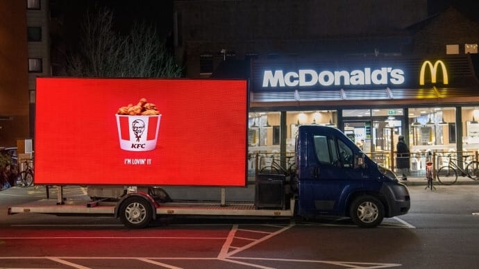 A rede KFC lançou a hashtag #untilwecanfingerlickagain e tem usado o slogan de outras marcas em seu logo. Como se isso não bastasse, agora também tem utilizado painéis móveis, rebocados por pickups que estacionam na frende de lojas de outras marcas, como o McDonald’s, por exemplo.