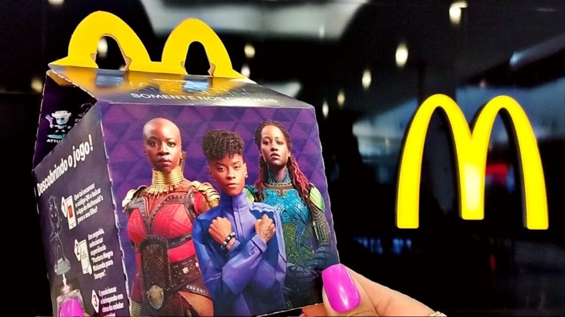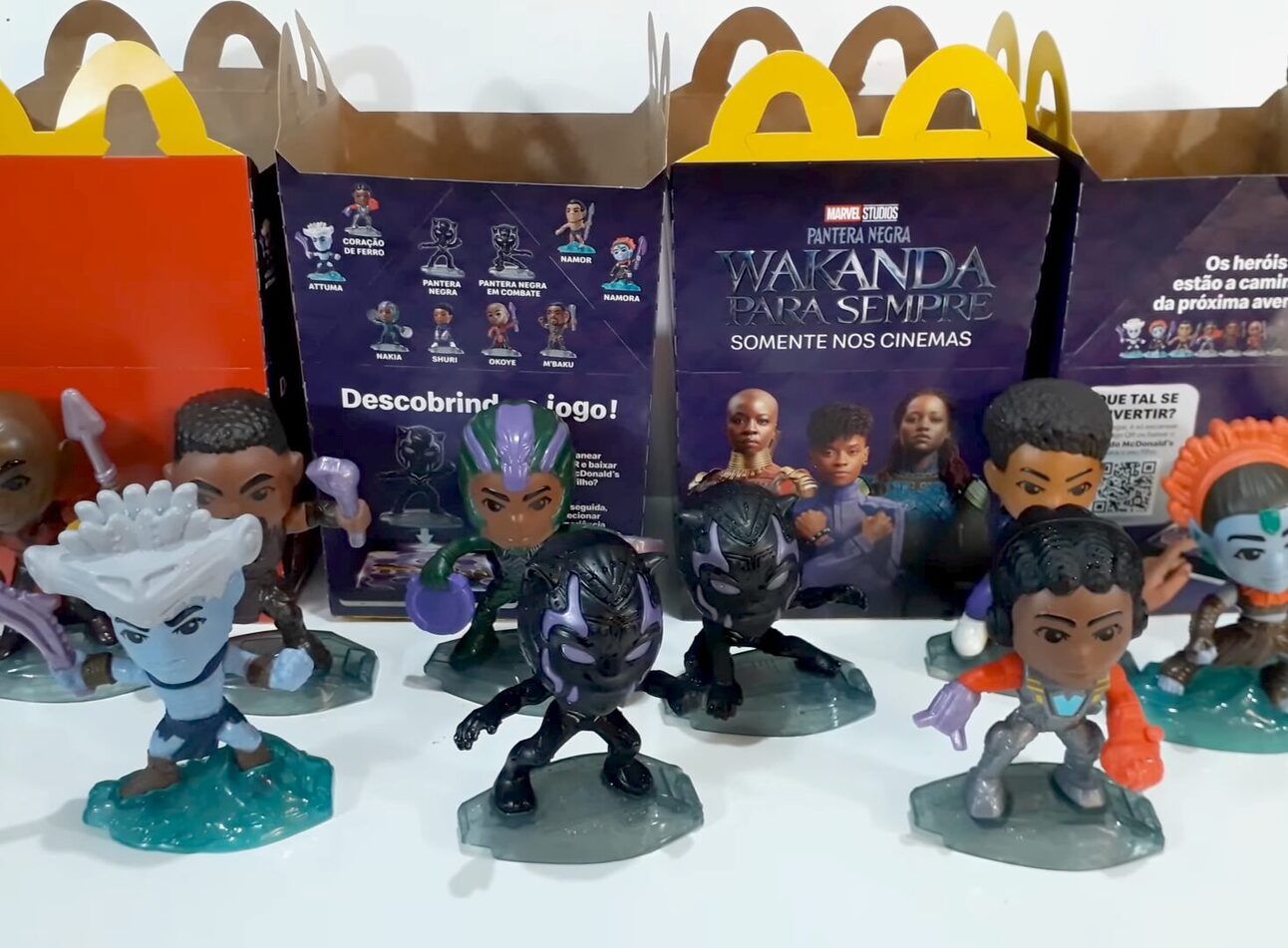 O McLanche Feliz inspirado no filme Pantera Negra: Wakanda Para Sempre começou a circular no dia 01/11, e traz 10 brindes com personagens articulados que e mudam a cor do vibranium quando colocados em água gelada.