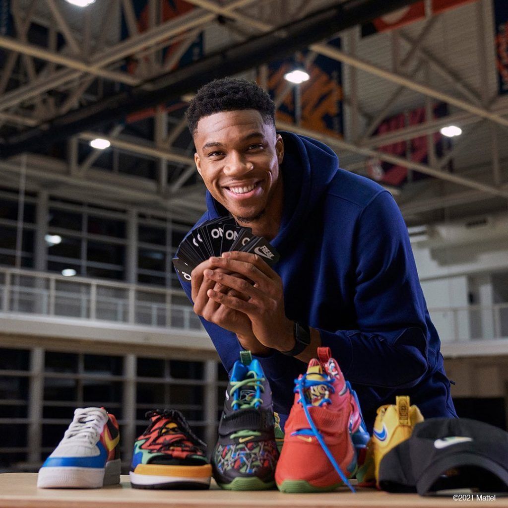 A Nike lança, essa semana, uma coleção de roupas e tênis que conta com a parceria do jogador de basquete, e fã de Uno, Giannis Antetokounmpo. A coleção traz, obviamente, os elementos característicos das cartas do jogo que aparecem nos modelos Zoom Freak 3, Air Force 1 e Offline Mule. O padrão também aparece nas roupas. A coleção deve estar disponível em breve. Tudo Lindo.