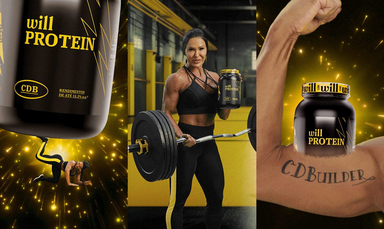 O novo produto é, na verdade, um produto bancário. Batizado com boa dose de humor e trocadilhos, o CDBuilder, do will bank, oferece “taxas proteinadas de até 15,2% ao ano e promete “no pain e muito gain”. Na campanha de apresentação, Gracyanne aparece em versão “franguinho” e “monstrão” para mostrar a diferença.