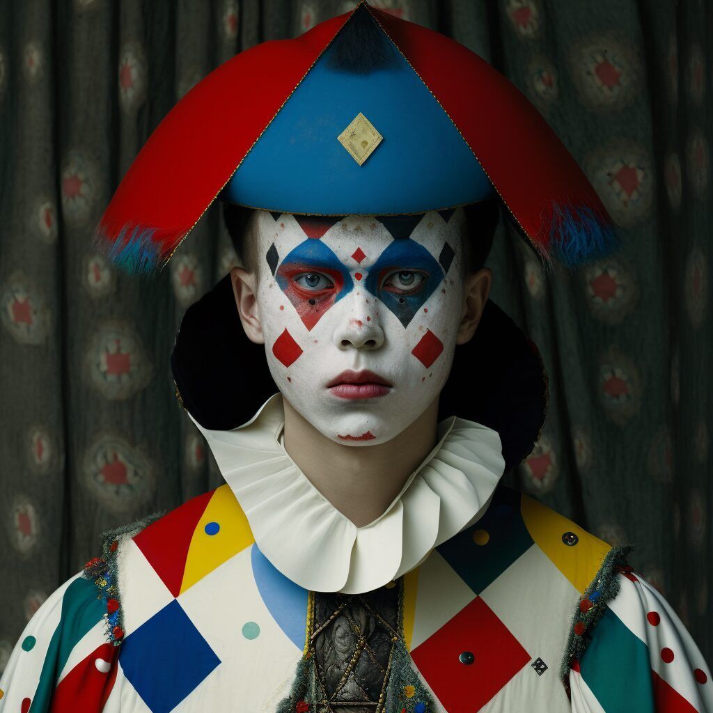 Gerei versões dos tradicinais Pierrot, Colombina e Arlequim no MidJourney. Os três personagens formam um triângulo amoroso baseado numa comédia italiana do século XVI. Pierrot vive um amor não correspondido por Colombina e ela é apaixonada por Arlequim.