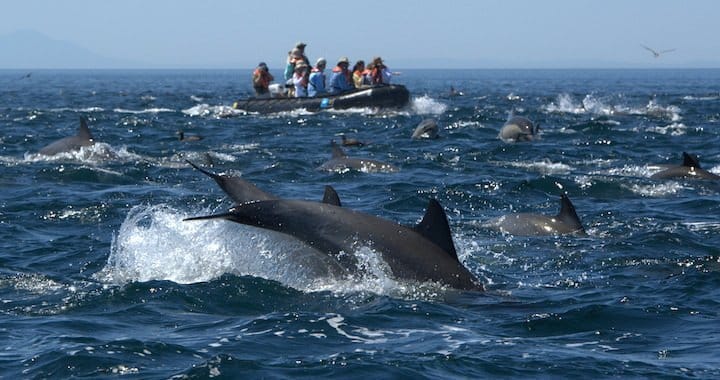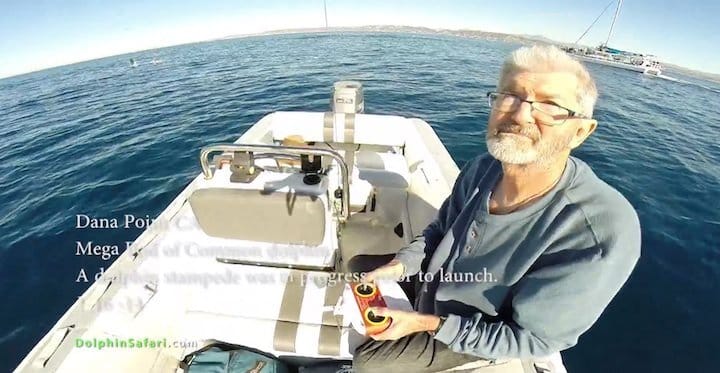 Desta vez é um “estouro de golfinhos” em Dana Point, California. São milhares de golfinhos e algumas baleias nadando juntos, da mesma maneira como fazem tantos outros animais que viajam em bandos, fazendo migrações espetaculares. O registro do alto traz uma visão inédita, de um novo ângulo que permite ver os golfinhos também em baixo da água e de uma distância muito próxima, que não seria permitido por lei para não perturbar os animais.