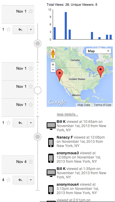 Ao abrir a mensagem enviada, ao lado dela aparecem mais detalhes: quantas vezes o destinatário viu a mensagem, qual plataforma ele utilizou e em que região se encontrava.
