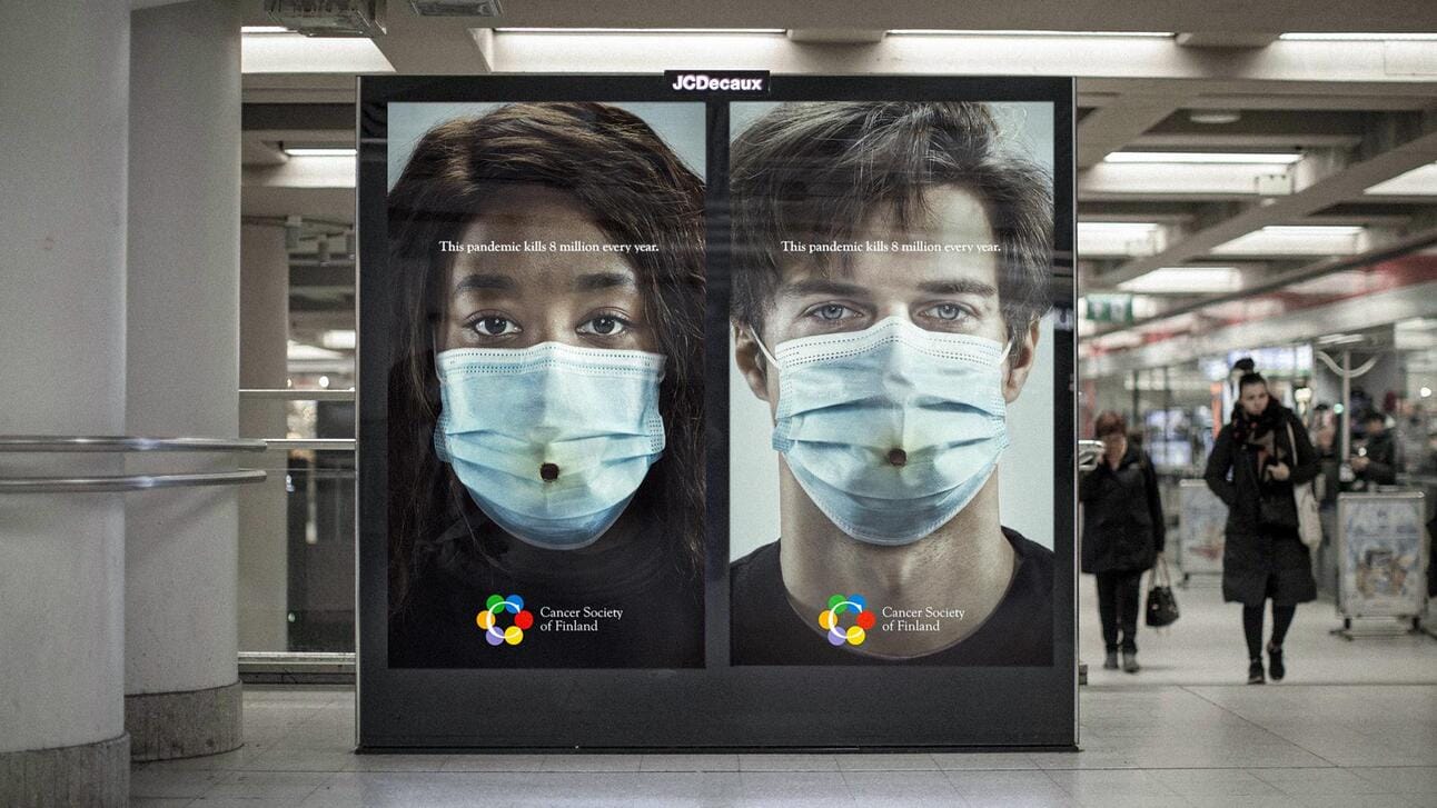 Criação da TBWA de Helsinki para o Cancer Society of Finland lembrando que o cigarro mata mais de 8 milhões de pessoas todos os anos, há décadas. A estratégia é utilizar todo o engajamento gerado pela Covid e todas as adaptações de hábitos por milhões de vidas de fumantes que ainda persistem com o vício apesar dos perigos.