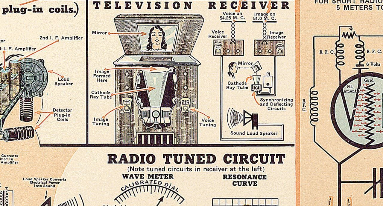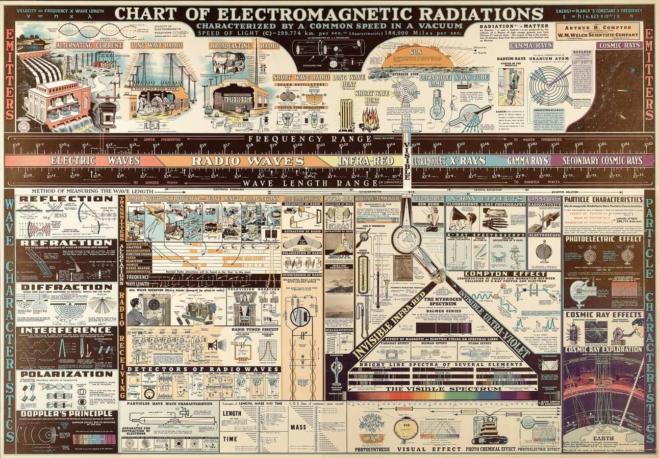 Não que você tenha um particular interesse em radiação eletromagnética. Mas não é sempre que aparece um infográfico de 1944 para gente dar uma espiada. Provavelmente nem tinha esse nome moderninho, devia ser chamado de “poster” mesmo e pronto. Mas a intenção era a mesma, a de simplificar, reunir e explicar com muitos recursos visuais um assunto que tende ao complexo. Com certeza deve ter tado um trabalhão na época, fazer toda essa pesquisa e produzir as ilustrações com métodos bem diferentes dos atuais.
