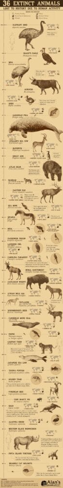 O Dodô – e mais 35 espécies que também nunca mais serão vistas por aí – você confere abaixo nesse infográfico criado pela Alan’s Factory Outlet